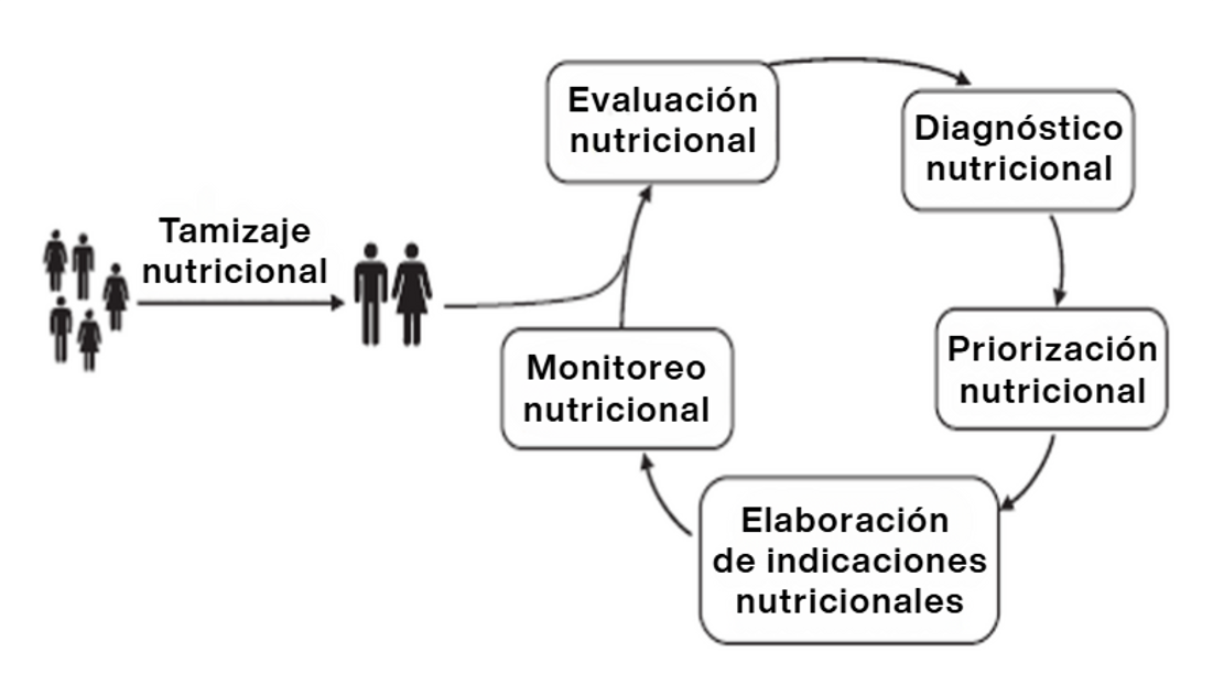 La aplicación en cada paciente del Proceso Estandarizado de Atención Nutricional basado en 5 pasos: